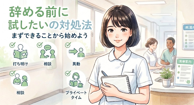 パワハラ・いじめが明確な場合は、師長や看護部長、または院内のハラスメント相談窓口に相談しましょう。「自分が弱い」のではなく、組織として解決すべき問題です。記録(日時・言動)を残しておくと、相談の際に説明しやすくなります。