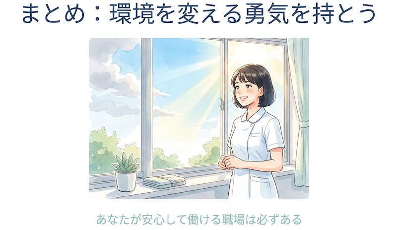 師長や管理職自身がハラスメントの加害者である、相談しても「そういうものだ」と流される、改善の気配がまったくない——こうした状況は個人の努力では変えられません。組織の文化そのものが問題の場合、転職が最善の選択です。