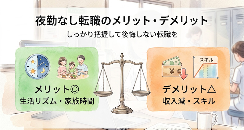 夜勤なしへの転職には多くのメリットがある一方で、注意すべき点もあります。両方を正直に見ておきましょう。