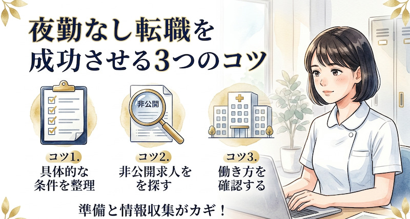 夜勤なし転職を成功させるには、求人の探し方と準備が重要です。以下の3つのコツをおさえておきましょう。